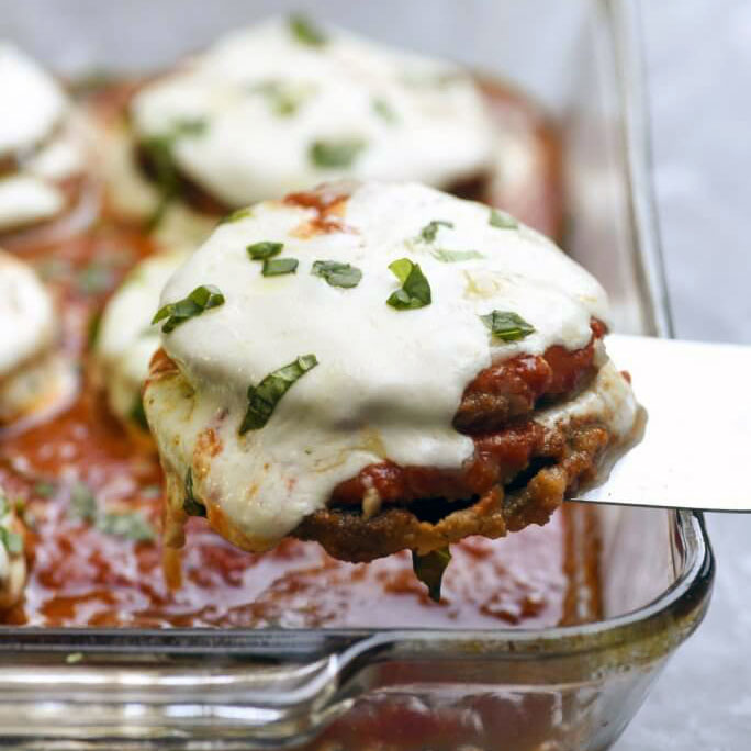 - Pour 1 cup of marinara into a 13″ x 9″ inch baking dish and spread out evenly to cover the bottom of the dish. Place a layer of breaded eggplant slices in the sauce. Cover each slice with a spoonful of remaining marinara, a slice or two of mozzarella, sprinkle with Parmesan cheese and top with half of the basil. Repeat with one more layer of eggplant, sauce, mozzarella, and Parmesan (reserve remaining basil for later). Pour any leftover marinara and around edges of eggplant slices.