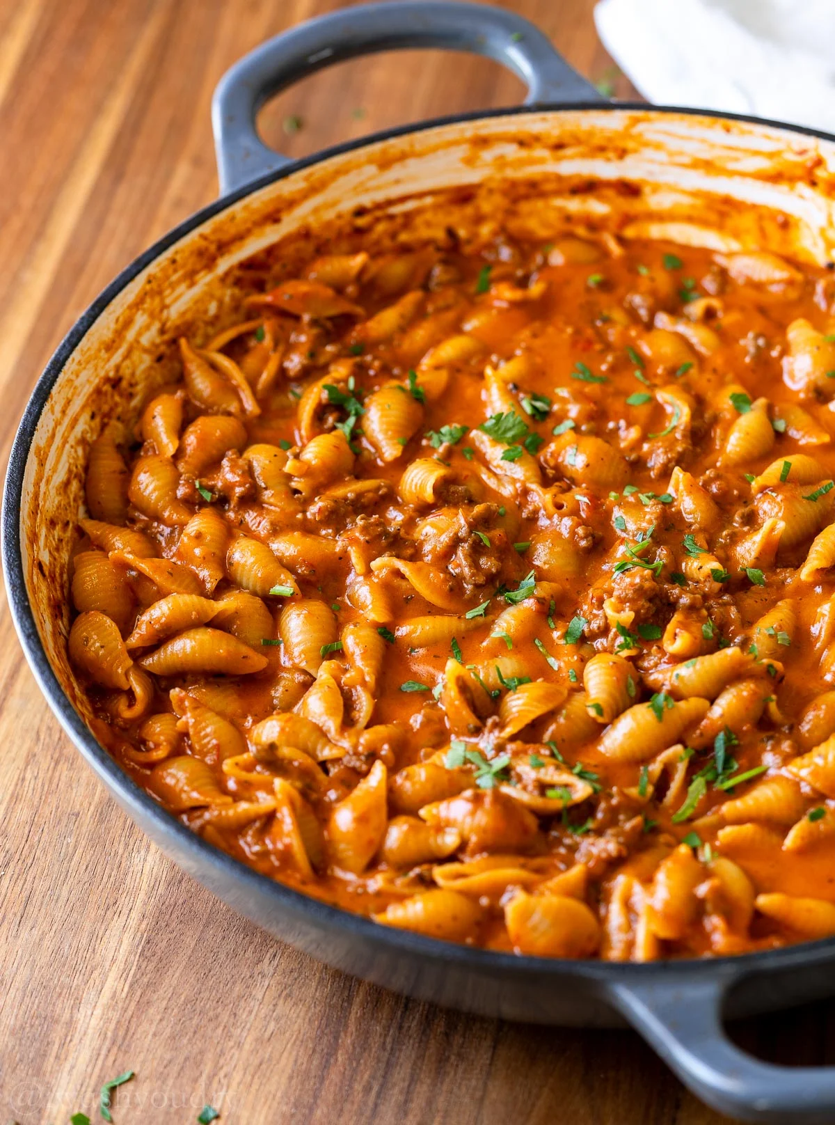 - Stir in the garlic and Italian seasoning, cook until fragrant, about 30 seconds. Pour in the beef broth, milk and pasta sauce, bring the mixture to a boil.