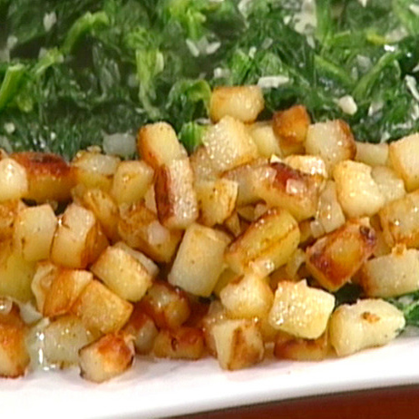 - Heat the oil and melt the butter in a skillet over high heat. Add the onions and cook, stirring, for 2 minutes. Add the garlic, and cook, stirring, for 20 seconds. Add the potatoes, Essence, thyme, salt, and pepper, and cook without stirring, but shaking the pan occasionally to keep from burning, until the potatoes begin to color and crisp on the underside, about 4 minutes. Turn the potatoes with a spatula being careful not to mash, and continue cooking until uniformly golden.