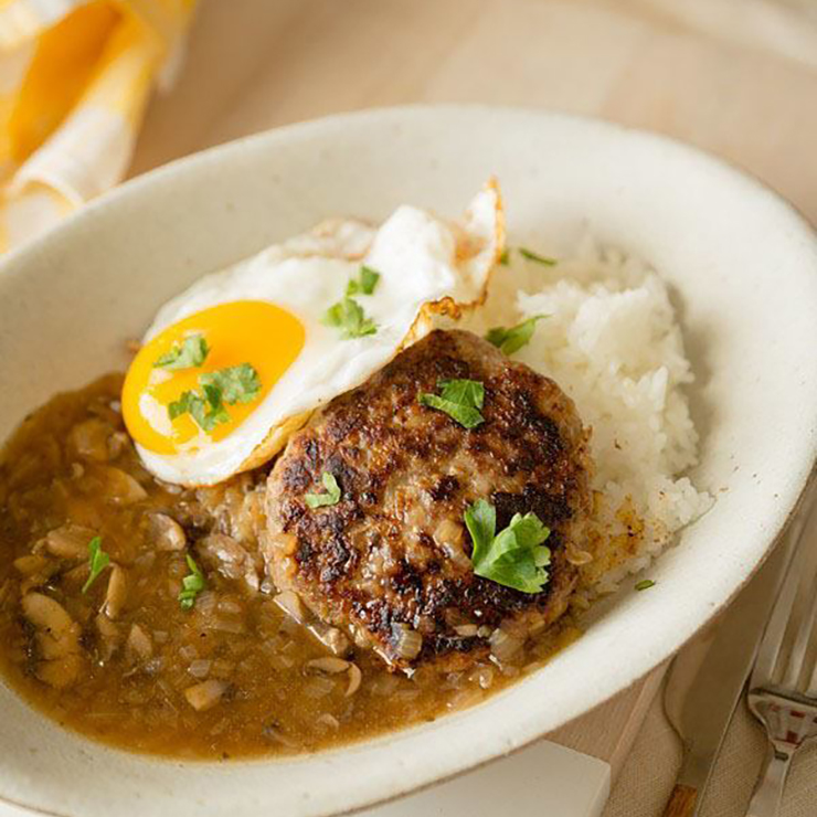 Serve steamed rice on individual plates. Transfer the patties to the plates, pour the gravy, and top with a fried egg. Serve immediately.