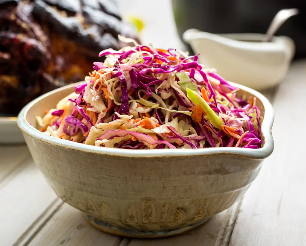 - Pour the dressing over the cabbage and toss. Season to taste. The coleslaw may be covered with plastic wrap and refrigerated. Toss again before serving.