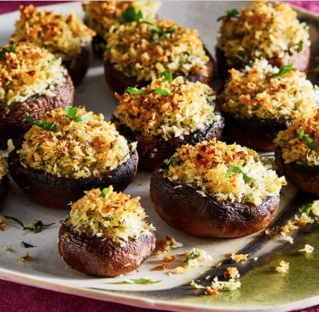 3. Drizzle the mushrooms with the remaining olive oil and transfer to the oven and bake until the tops are crisp and golden, about 15 minutes. Remove from the oven and allow to cool for about 5 minutes.