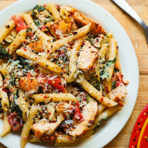 Chicken and Bacon Pasta with Spinach and Tomatoes in Garlic Cream Sauce