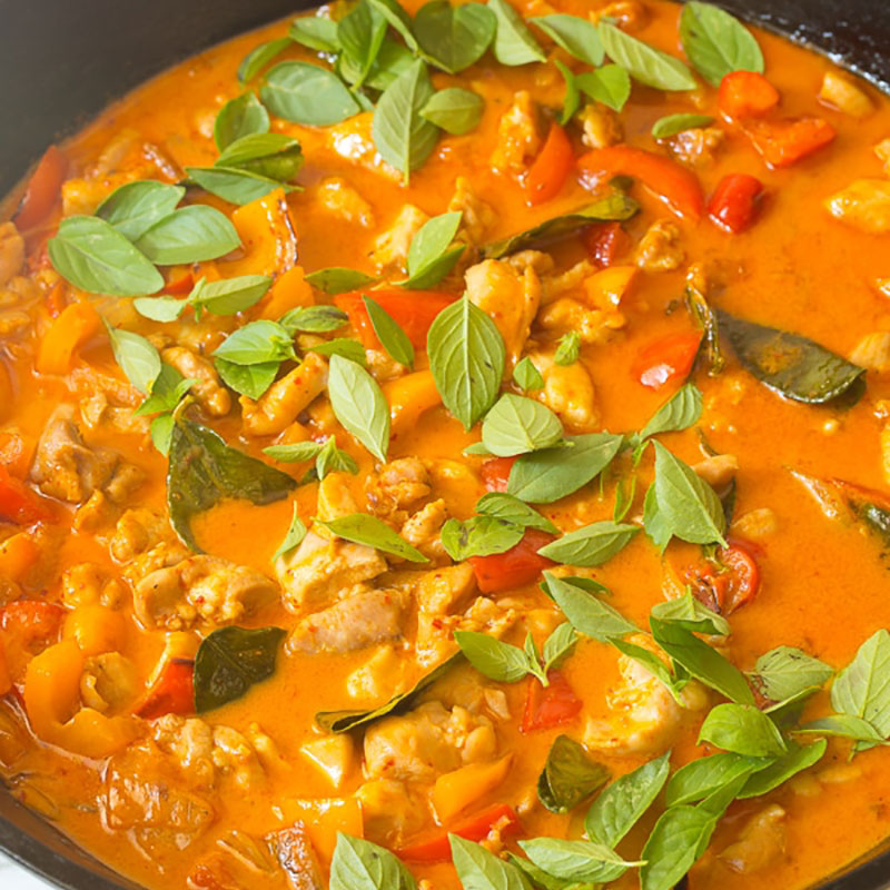 - Stir in the chopped chicken and bring to a boil. Lower the heat and simmer for 10-15 minutes, until the chicken is cooked through and the sauce thickens. Stir occasionally. Remove from heat and stir in the basil leaves. Serve with rice, quinoa, or noodles.